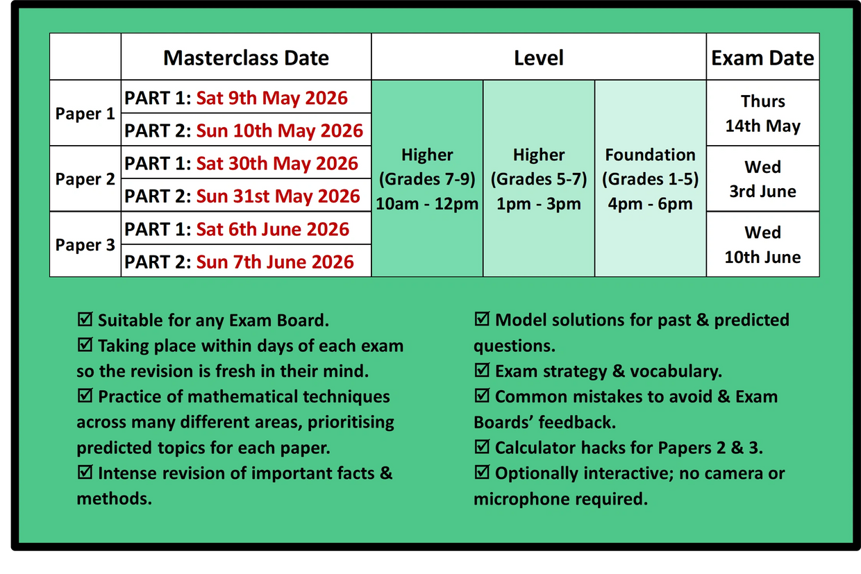 Each 3 hour-long Masterclass will be delivered via Microsoft Teams and split into two parts over the weekend before each exam, with separate Masterclasses for different target grades and a maximum of 20 students per Masterclass.